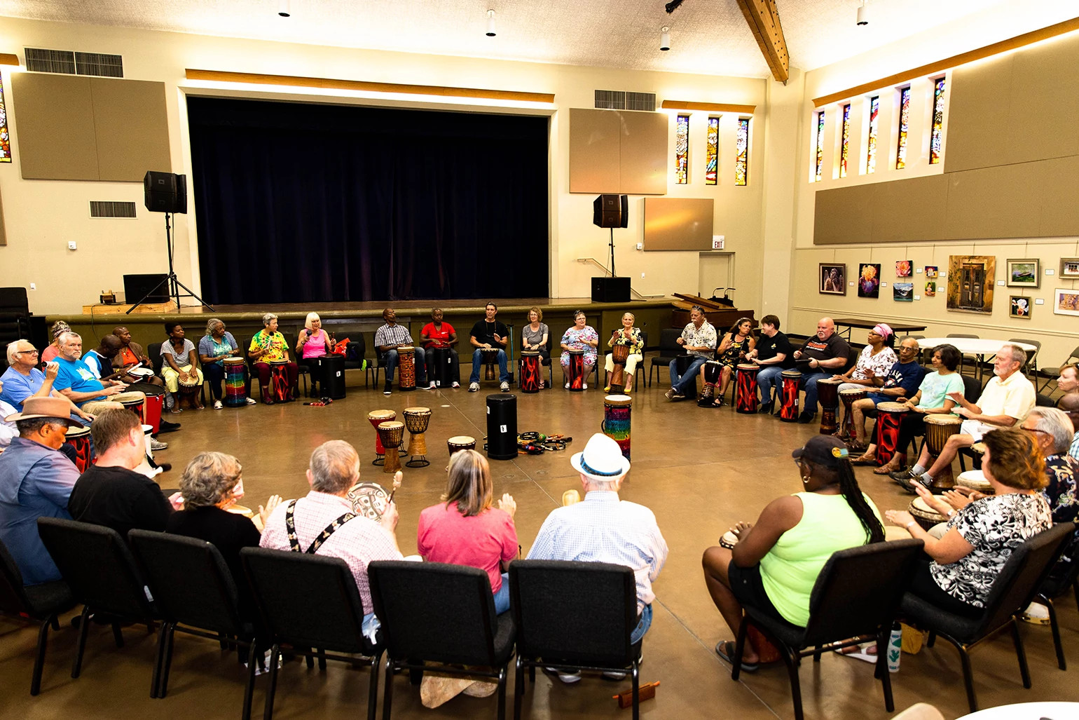 We are seated in a circle, joining our hands in the large gathering space, as the warm sun streams through stained glass onto our smiling faces. We are diverse in age and gender, in race and in faith. We’re from various generations and backgrounds. Some of us are friends, family or neighbors, but many of us are meeting for the first time. There are more than 30 of us. But when the drumming starts, we are one — celebrating life, community and the joy of the present moment.