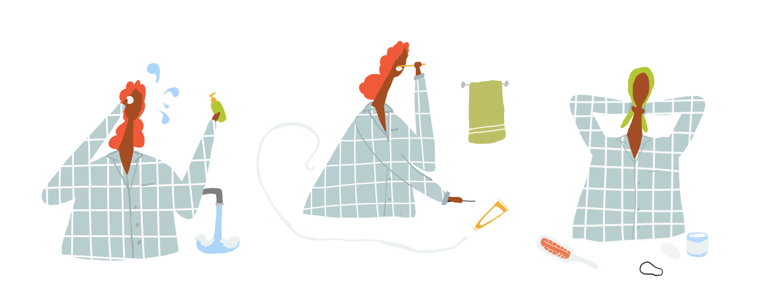 Then, I remove my contact lenses, squeeze lubricating drops into my eyes and shoot saline mist into my nose. I wash my face, apply eye cream and moisturizer. After I’ve moisturized, it’s time for a few minutes of rigorous facial exercises Jack LaLanne-style, tilting my head backward and thrusting my lower jaw forward repeatedly. Next, I brush, floss and gargle. After taking care of my face, I shower — but only from the neck down — sometimes throwing in some more facial exercises while I soap and rinse. Once out of the shower I moisturize my whole body, paying particular attention, of course, to my elbows and knees to ward off even a semblance of ash. Finally, I oil my scalp and hairline and tie on a satin scarf to “lay” my edges. Then and only then, at least 30 minutes after I began to go to bed, I actually allow my head to (very gently) hit the pillow.