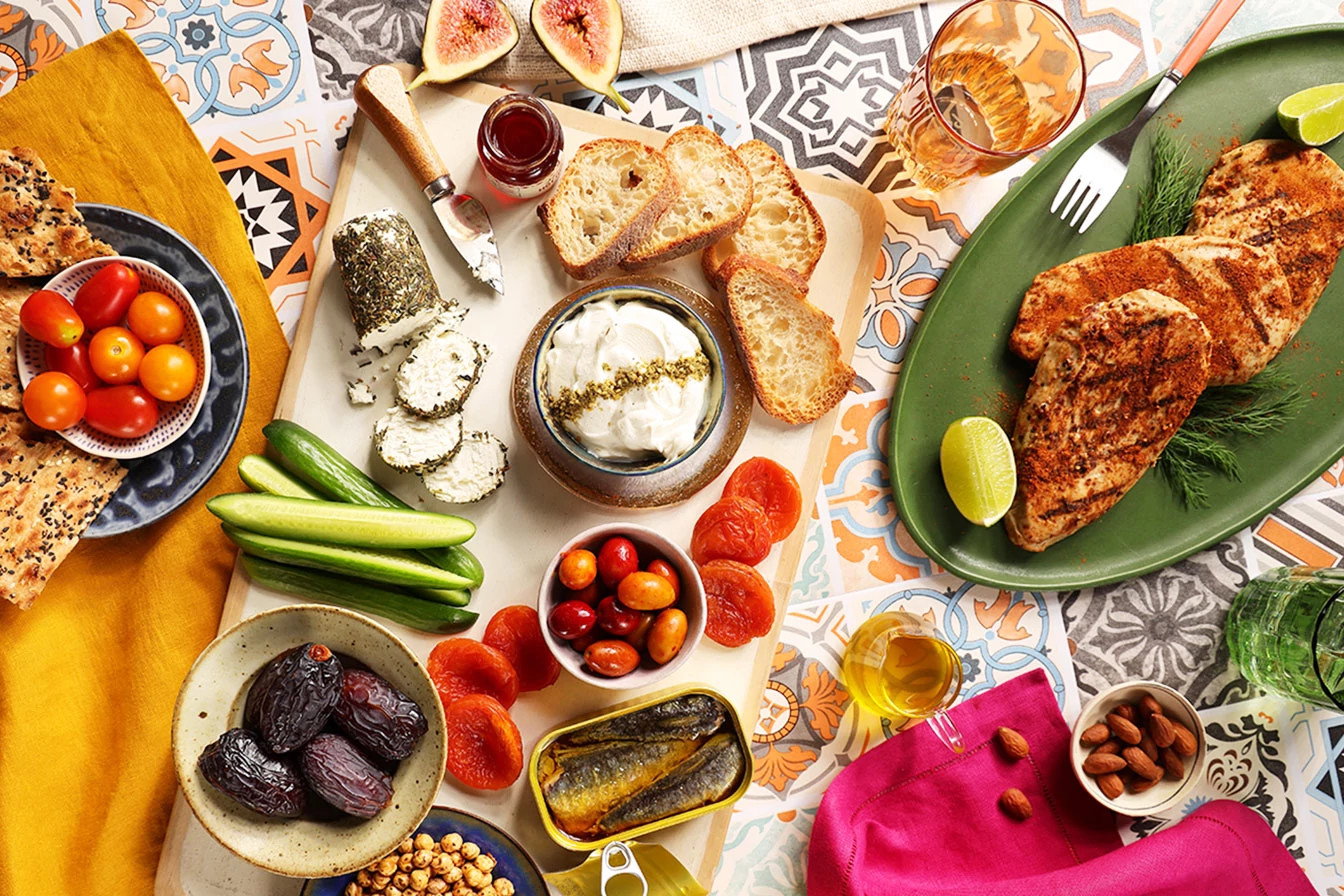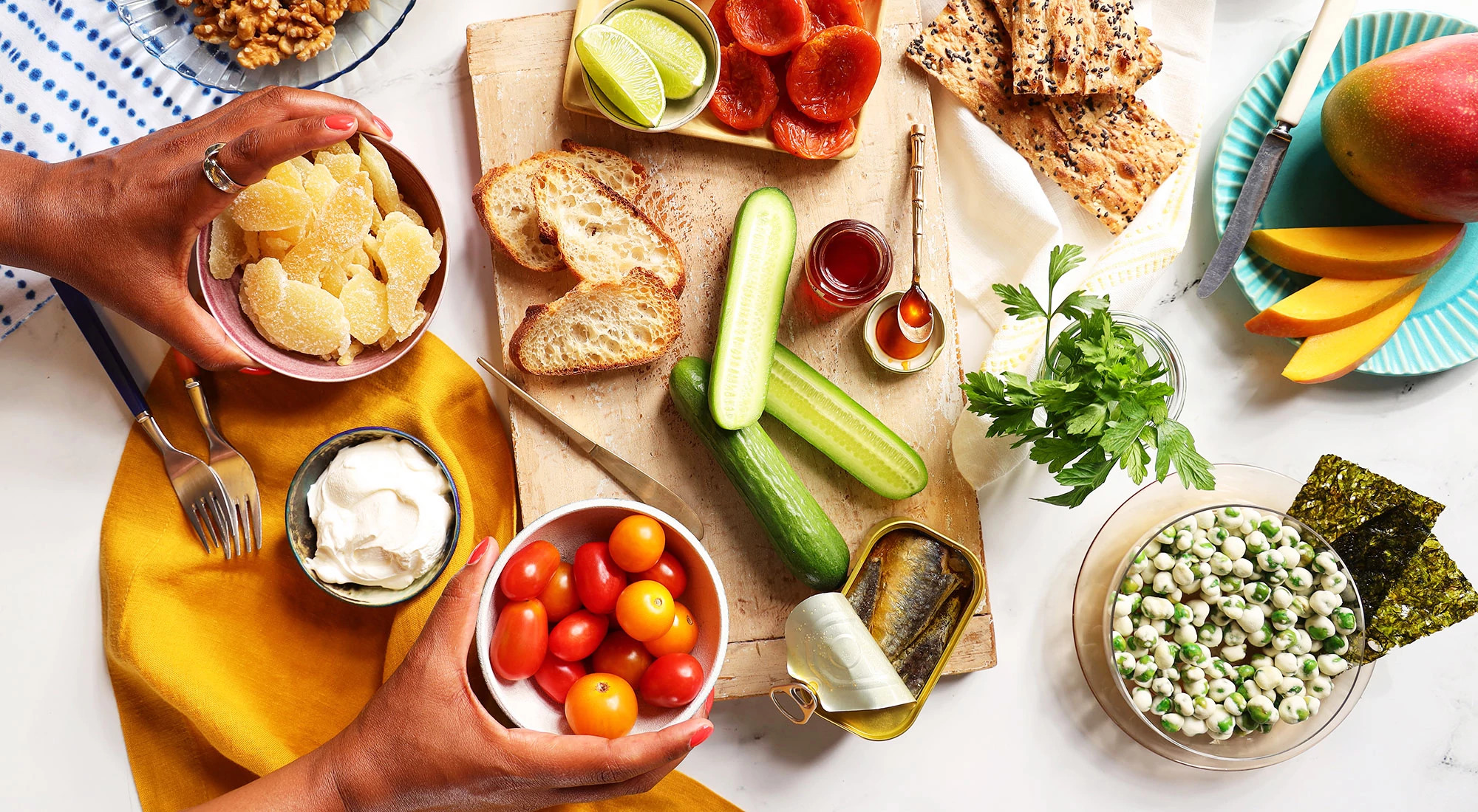 “The small bursts of juicy sweetness in the cherry tomatoes provide a generous dose of vitamins A and C,” Agyeman says. Labneh, a type of Middle Eastern strained yogurt, does double duty in this board. “Packed with probiotics and calcium, labneh’s creaminess and tanginess adds the perfect flavor to the board and can be easily paired with vegetables.” Having a good charcuterie board requires a balance of protein, fats and carbs to satisfy, which Agyeman does by adding whole-grain crostini, spicy olives and sardines (high in omega-3 fatty acids). Dried apricots and figs add a sweet and fiber-rich component (and are a nod to the open-air markets in Morocco teeming with dried fruits!).