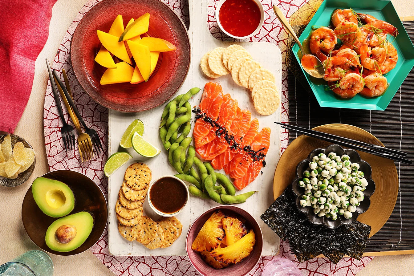 “High in vitamins A and C, the mango adds tropical sweetness and a refreshing touch to the board and balances the other flavors,” Agyeman says. Her ode to the Caribbean is also seen in the Jerkyaki Sauce and grilled pineapple. “Uniting Asian and Caribbean elements, the Jerkyaki sauce brings savory tanginess, enhancing the board’s fusion with flavor,” she says. “Grilled pineapple brings a smoky-sweet goodness, and it’s also a source of vitamin C to support immunity.” Agyeman balances out the tropical flavors with some umami-rich Asian foods. “Seaweed snacks are rich in iodine and trace minerals to support thyroid health, and provide a unique umami flavor that elevates the board,” she says. Avocado rounds out the board by providing some creaminess to complement some of the bolder flavors, like the spicy wasabi peas.