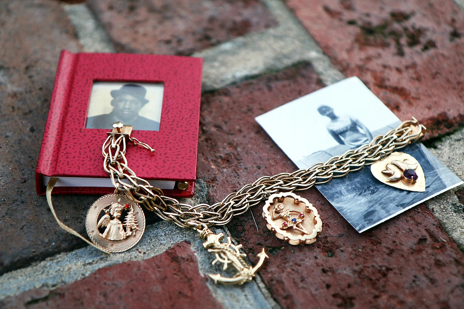 The bracelet has thick gold links that look like a fishtail braid and a heavy slide and lock closure. When it was my mother’s, it had a round charm with a Christmas angel and a tree on it and a second heart-shaped charm with two doves kissing above a faux garnet, markers of events in the beginning of a life together. I always loved that bracelet; I’ve always loved all bracelets. A signal of <em>girl cool</em> for me was stacked silver bangles; I loved how their chimes punctuated the around-the-way attitude of the kind of girl I thought I wanted to be.