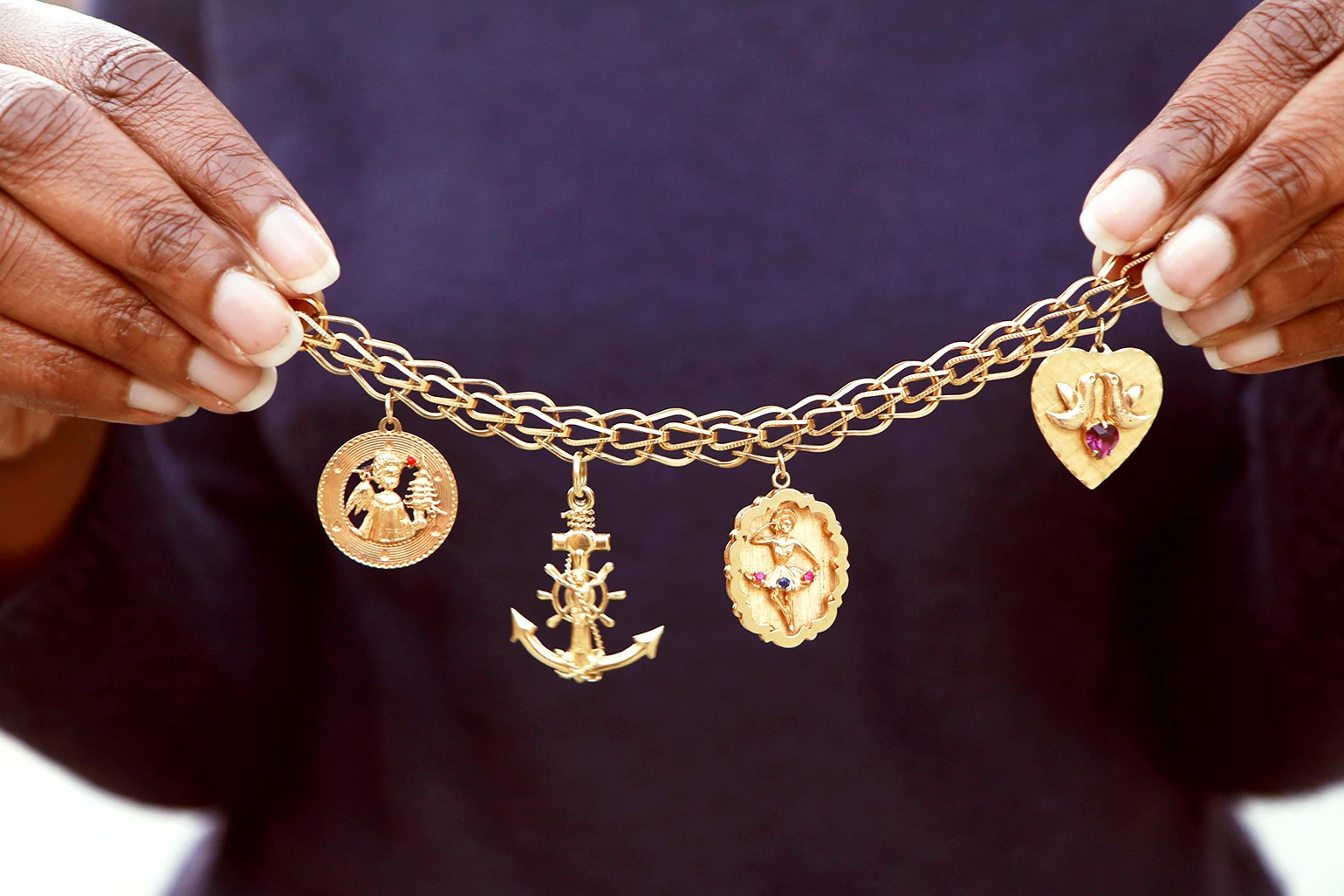 When my mother gave the bracelet to me, she added an oval charm with a ballerina mid-twirl, engraved on the back with “Love, Mom” and the year. I couldn’t believe it was mine. It had never occurred to me that she might give it to me. It hadn’t even occurred to me to ask. Even better, I’d gained something that could keep improving. One year, she added a golden anchor to acknowledge my love of travel. When my son was born, I got a gold birth certificate charm with his name on it. Three generations on my wrist.