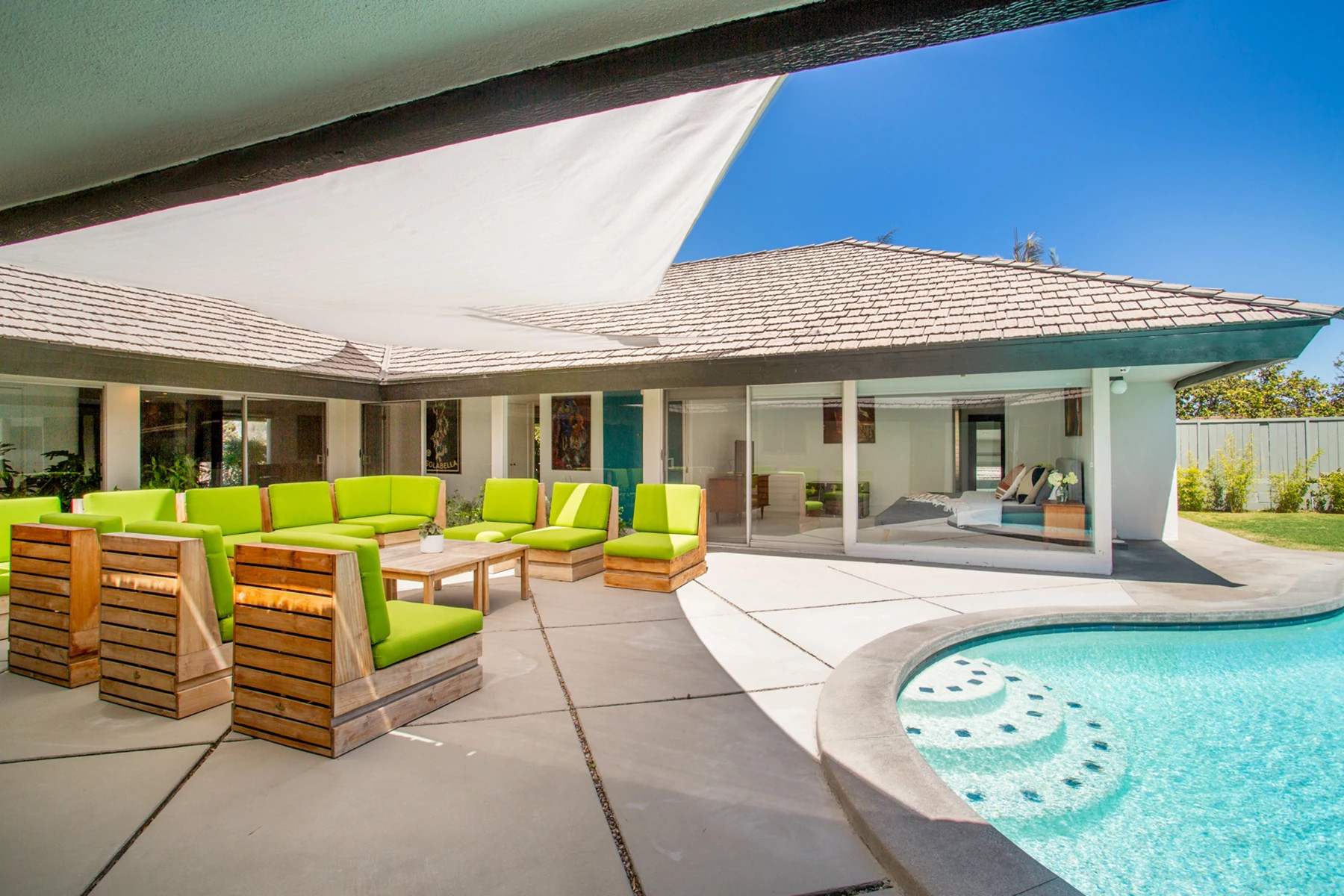 The Space: Newly renovated mid-century modern gated property with a heated pool, a modern chef’s kitchen, an outdoor lounge, a fireplace and cool vintage decor.